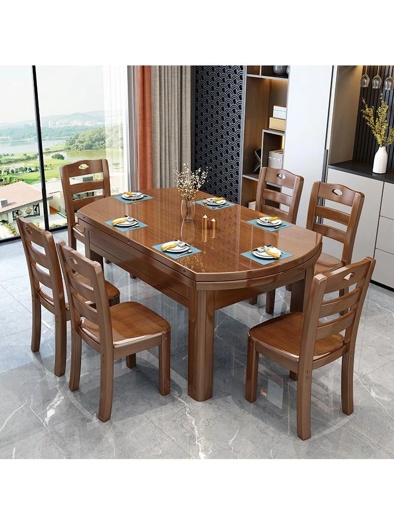 全実木製中式ダイニングテーブル&チェアセット - 伸縮可能な折りたたみ式、丸型&四角型の2wayデザイン!家庭での食事をより快適に楽しむための理想的な家具です。