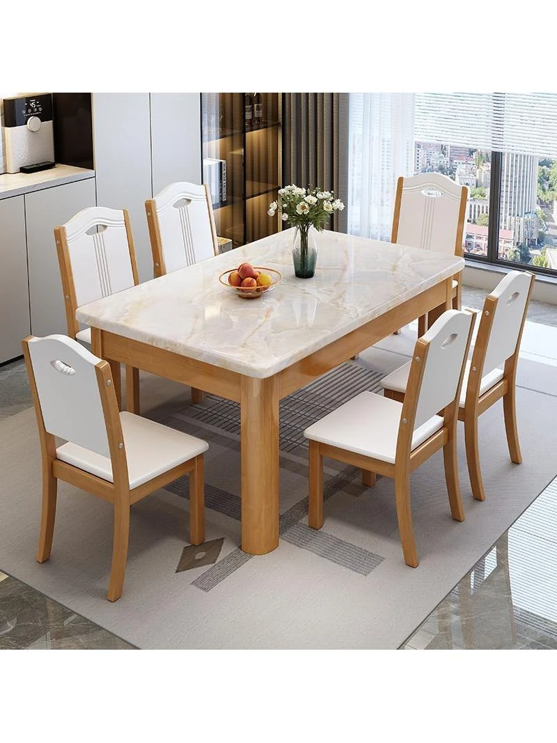 モダンでシンプルな大理石ダイニングテーブルとチェアセット - 4人用・6人用、長方形の天然木製、狭いスペースにもぴったり!家族や友人との食事を特別なひとときに演出します。
