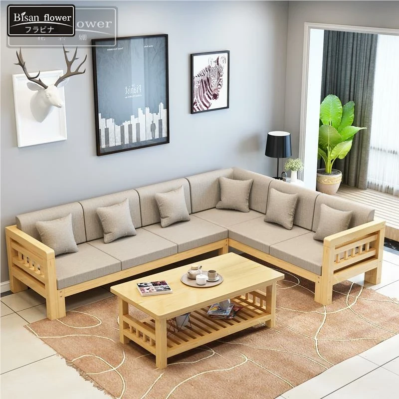 モダンミニマリスト全木製ソファセット - 小型リビングに最適なコーナーシェーズロング型、パイン材の3人掛け中華スタイルソファで、スタイリッシュで快適な空間を演出します!