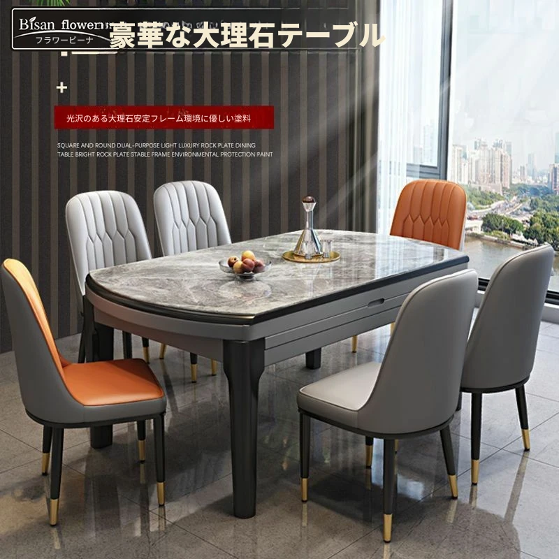 伸縮可能な折りたたみダイニングテーブルセット!厚手の引き出し式グロスストーン天板で、スタイリッシュな円形デザイン。家族や友人との食事に最適、スペースを無駄にしない便利なアイテムです!